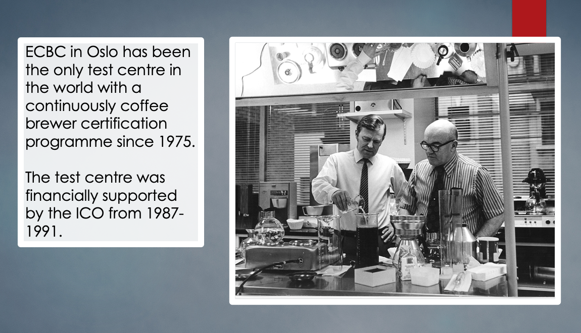 The European Coffee Brewing Centre (ECBC) was established in 1971 by The Norwegian Coffee Association. ECBC is an independent testing authority.The mission of ECBC is to test coffee brewing equipment according to The Gold Cup Standard. This standard is based upon scientific research from the Pan American Coffee Institute, European Coffee Brewing Centre and Specialty Coffee Association. The test program is developed by coffee science experts and professional coffee tasters to ensure precise standards for brewer evaluation. The coffee brewing equipment that passes the tests will be allowed to carry the Seal of Approval.